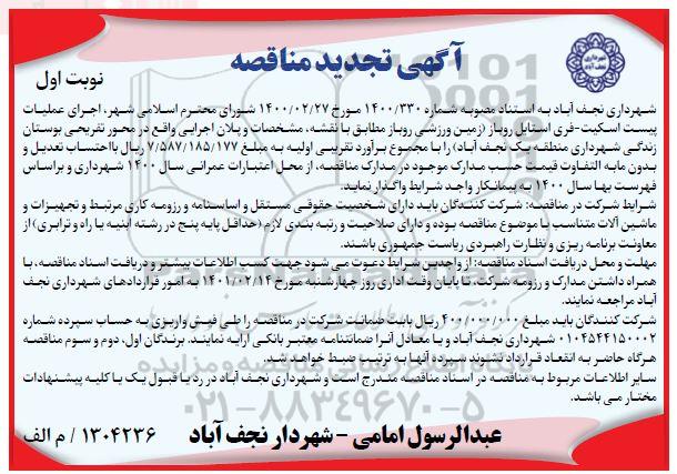 شهرداری نجف آباد به استناد مصوبه شماره 1400/330 مورخ 1400.2.27 شورای محترم اسلامی شهر، اجرای عملیات پیست اسکیت - فری استایل روباز ( زمین ورزشی روباز ) مطابق با نقشه مشخصات و پلان اجرایی واقع در محور تفریحی بوستان زندگی شهرداری منطقه یک نجف آباد را با مجموع براورد تقریبی اولیه به مبلغ 7.587.185.177 ریال با احتساب تعدیل و بدون مابه تفاوت قیمت حسب مدارک موجود در مدارک مناقصه از محل اعتبارات عمرانی سال 1400 شهرداری و براساس فهرست بها سال 1400 به پیمانکار واجد شرایط واگذار نماید.