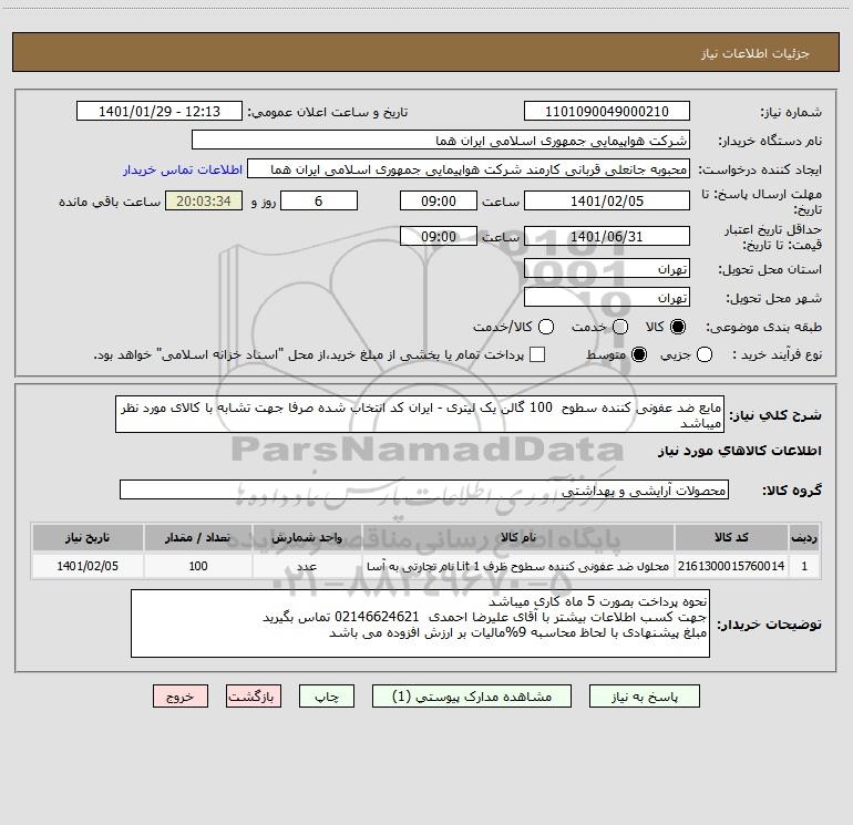 شرح کلی نیاز: مایع ضد عفونی کننده سطوح 100 گالن یک لیتری - ایران کد انتخاب شده صرفا جهت تشابه با کالای مورد نظر میباشد