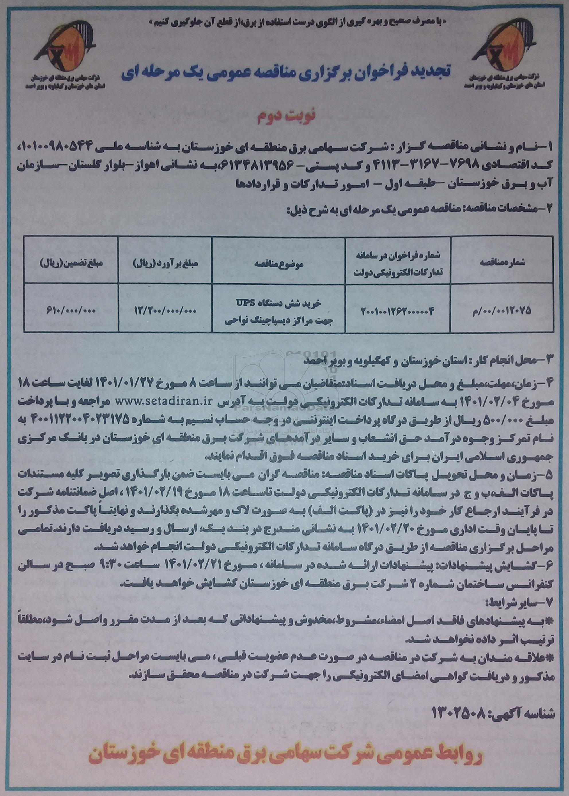 فراخوان مناقصه خرید شش دستگاه ups جهت مراکز دیسپاچینگ نواحی تجدید نوبت دوم , فراخوان مناقصه خرید شش دستگاه ups جهت مراکز دیسپاچینگ نواحی تجدید نوبت دوم