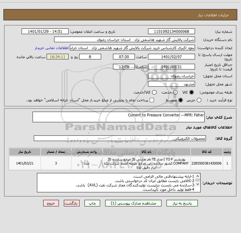 شرح کلی نیاز: Current to Pressure Converter ---MFR: Fisher