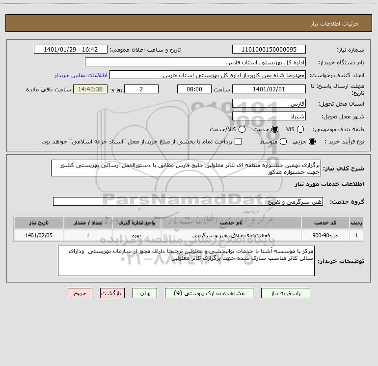 شرح کلی نیاز: برگزاری نهمین جشنواره منطقه ای تئاتر معلولین خلیج فارس مطابق با دستورالعمل ارسالی بهزیستی کشور جهت جشنواره مذکور