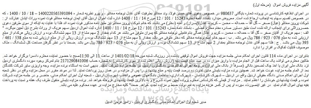 در اجرای ابلاغیه کارشناسی در پرونده شماره بایگانی 980637 در خصوص دعوی آقای حسین فولاد وند مغانلو بطرفیت آقای عادل نوجامه مغانلو ، و پیرو نظریه شمار ه 1400220565391094 – 18 / 10 / 1400 ، که در خصوص تقسیم سهام به اینجانب ارجاع شده است. معروض میدارد باستناد نامه شماره 15243 / 101 / 12 مورخ 14 / 11 / 1400 اداره ثبت احوال اردبیل آقای ایمان نوجامه مغانلو فوت نموده وراث ایشان عبارتند از : شوکت پروین مغانلو (عیال) صفر – گل آقا – حمداله – محسن – کریم – عادل (پسران) و آمنه (دختر) می باشند که خانم شوکت پروین مغانلو نیز طبق نامه مذکور فوت نموده اند فلذا با عنایت به اینکه از سوی طرفین دعوی حصروراثتی برای اینجانب ارائه نشده است طبق دستور صادره مقام محترم قضایی ، باستناد نامه شماره 15243 / 101 / 12 مورخ 14 / 11 / 1400 اداره ثبت احوال اردبیل سهم هریک از وراث بشرح ذیل تعیین میگردد " الف : سهم هریک از آقایان صفر – گل آقا – حمداله – محسن – کریم و عادل همگی بنام فامیلی نوجامه مغانلو که پسران متوفی می باشند هر کدام بمقدار 2 سهم مشاع از 13 سهم ششدانگ بوده و ارزش ریالی هرکدام از مبلغ ارزیابی شده به مبلغ 076 / 923 / 786 ریال می باشد . ب : سهم خانم آمنه نوجامه مغانلو که دختر متوفی می باشد بمقدار 1 سهم مشاع از 13 سهم ششدانگ بوده و ارزش ریالی آن از مبلغ ارزیابی شده به مبلغ 538 / 461 / 393 ریال می باشد . ج : فلذا سهم آقای عادل نوجامه مغانلو بمقدار 2 سهم مشاع از 13 سهم ششدانگ بوده و ارزش ریالی آن به مبلغ 076 / 923 / 786 ریال می باشد .ضمنا با در نظر گرفتن مساحت کل ششدانگ ، ملک موصوف قابلیت تفکیک و افراز را ندارد