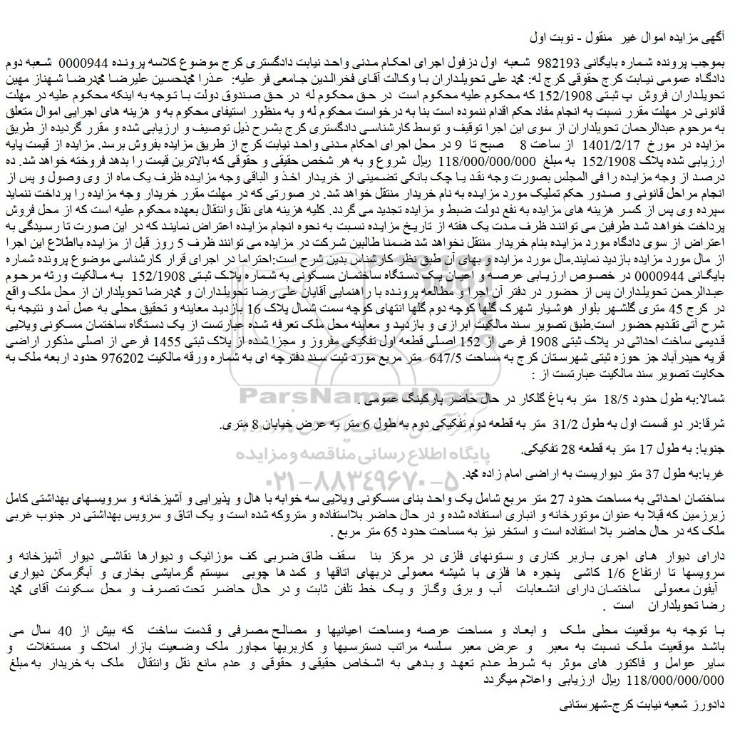 بموجب پرونده شماره بایگانی 982193 شعبه اول دزفول اجرای احکام مدنی واحد نیابت دادگستری کرج موضوع کلاسه پرونده 0000944 شعبه دوم دادگاه عمومی نیابت کرج حقوقی کرج له: محمد علی تحویلداران با وکالت آقای فخرالدین جامعی فر علیه: عذرا محمدحسین علیرضا محمدرضا شهناز مهین تحویلداران فروش پ ثبتی 152/1908 که محکوم علیه محکوم است در حق محکوم له در حق صندوق دولت با توجه به اینکه محکوم علیه در مهلت قانونی در مهلت مقرر نسبت به انجام مفاد حکم اقدام ننموده است بنا به درخواست محکوم له و به منظور استیفای محکوم به و هزینه های اجرایی اموال متعلق به مرحوم عبدالرحمان تحویلداران از سوی این اجرا توقیف و توسط کارشناسی دادگستری کرج بشرح ذیل توصیف و ارزیابی شده و مقرر گردیده از طریق مزایده در مورخ 1401/2/17 از ساعت 8 صبح تا 9 در محل اجرای احکام مدنی واحد نیابت کرج از طریق مزایده بفروش برسد. مزایده از قیمت پایه ارزیابی شده پلاک 152/1908 به مبلغ 118/000/000/000 ریال شروع و به هر شخص حقیقی و حقوقی که بالاترین قیمت را بدهد فروخته خواهد شد. ده درصد از وجه مزایده را فی المجلس بصورت وجه نقد یا چک بانکی تضمینی از خریدار اخذ و الباقی وجه مزایده ظرف یک ماه از وی وصول و پس از انجام مراحل قانونی و صدور حکم تملیک مورد مزایده به نام خریدار منتقل خواهد شد. در صورتی که در مهلت مقرر خریدار وجه مزایده را پرداخت ننماید سپرده وی پس از کسر هزینه های مزایده به نفع دولت ضبط و مزایده تجدید می گردد. کلیه هزینه های نقل وانتقال بعهده محکوم علیه است که از محل فروش پرداخت خواهد شد طرفین می توانند ظرف مدت یک هفته از تاریخ مزایده نسبت به نحوه انجام مزایده اعتراض نمایند که در این صورت تا رسیدگی به اعتراض از سوی دادگاه مورد مزایده بنام خریدار منتقل نخواهد شد ضمنا طالبین شرکت در مزایده می توانند ظرف 5 روز قبل از مزایده بااطلاع این اجرا از مال مورد مزایده بازدید نمایند.مال مورد مزایده و بهای آن طبق نظر کارشناس بدین شرح است:احتراما در اجرای قرار کارشناسی موضوع پرونده شماره بایگانی 0000944 در خصوص ارزیابی عرصه و اعیان یک دستگاه ساختمان مسکونی به شماره پلاک ثبتی 152/1908 به مالکیت ورثه مرحوم عبدالرحمن تحویلداران پس از حضور در دفتر آن اجرا و مطالعه پرونده با راهنمایی آقایان علی رضا تحویلداران و محمدرضا تحویلداران از محل ملک واقع در کرج 45 متری گلشهر بلوار هوشیار شهرک گلها کوچه دوم گلها انتهای کوچه سمت شمال پلاک 16 بازدید معاینه و تحقیق محلی به عمل آمد و نتیجه به شرح آتی تقدیم حضور است.طبق تصویر سند مالکیت ابرازی و بازدید و معاینه محل ملک تعرفه شده عبارتست از یک دستگاه ساختمان مسکونی ویلایی قدیمی ساخت احداثی در پلاک ثبتی 1908 فرعی از 152 اصلی قطعه اول تفکیکی مفروز و مجزا شده از پلاک ثبتی 1455 فرعی از اصلی مذکور اراضی قریه حیدرآباد جز حوزه ثبتی شهرستان کرج به مساحت 647/5 متر مربع مورد ثبت سند دفترچه ای به شماره ورقه مالکیت 976202 حدود اربعه ملک به حکایت تصویر سند مالکیت عبارتست از :