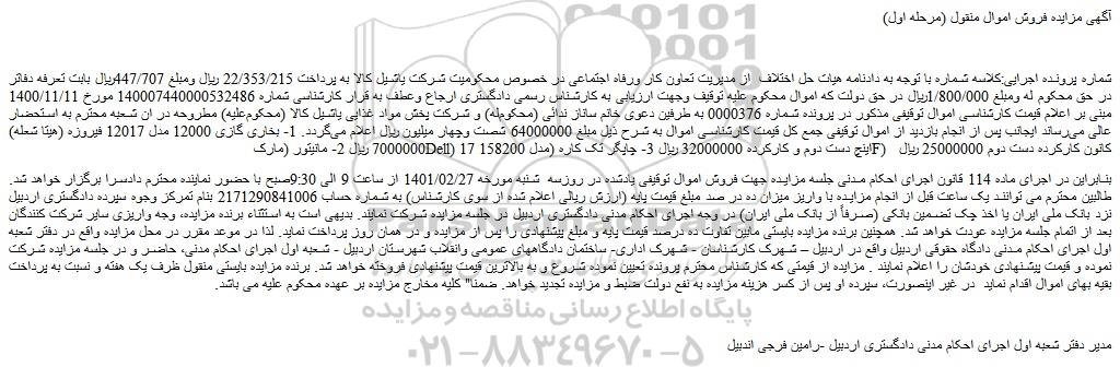 بنابراین در اجرای ماده 114 قانون اجرای احکام مدنی جلسه مزایده جهت فروش اموال توقیفی یادشده در روزسه شنبه مورخه 1401/02/27 از ساعت 9 الی 9:30صبح با حضور نماینده محترم دادسرا برگزار خواهد شد. طالبین محترم می توانند یک ساعت قبل از انجام مزایده با واریز میزان ده در صد مبلغ قیمت پایه (ارزش ریالی اعلام شده از سوی کارشناس) به شماره حساب 2171290841006 بنام تمرکز وجوه سپرده دادگستری اردبیل نزد بانک ملی ایران یا اخذ چک تضمین بانکی (صرفاً از بانک ملی ایران) در وجه اجرای احکام مدنی دادگستری اردبیل در جلسه مزایده شرکت نمایند. بدیهی است به استثناء برنده مزایده، وجه واریزی سایر شرکت کنندگان بعد از اتمام جلسه مزایده عودت خواهد شد. همچنین برنده مزایده بایستی مابین تفاوت ده درصد قیمت پایه و مبلغ پیشنهادی را پس از مزایده و در همان روز پرداخت نماید. لذا در موعد مقرر در محل مزایده واقع در دفتر شعبه اول اجرای احکام مدنی دادگاه حقوقی اردبیل واقع در اردبیل – شهرک کارشناسان - شهرک اداری- ساختمان دادگاههای عمومی وانقلاب شهرستان اردبیل - شعبه اول اجرای احکام مدنی، حاضر و در جلسه مزایده شرکت نموده و قیمت پیشنهادی خودشان را اعلام نمایند . مزایده از قیمتی که کارشناس محترم پرونده تعیین نموده شروع و به بالاترین قیمت پیشنهادی فروخته خواهد شد. برنده مزایده بایستی منقول ظرف یک هفته و نسبت به پرداخت بقیه بهای اموال اقدام نماید در غیر اینصورت، سپرده او پس از کسر هزینه مزایده به نفع دولت ضبط و مزایده تجدید خواهد. ضمنا" کلیه مخارج مزایده بر عهده محکوم علیه می باشد.