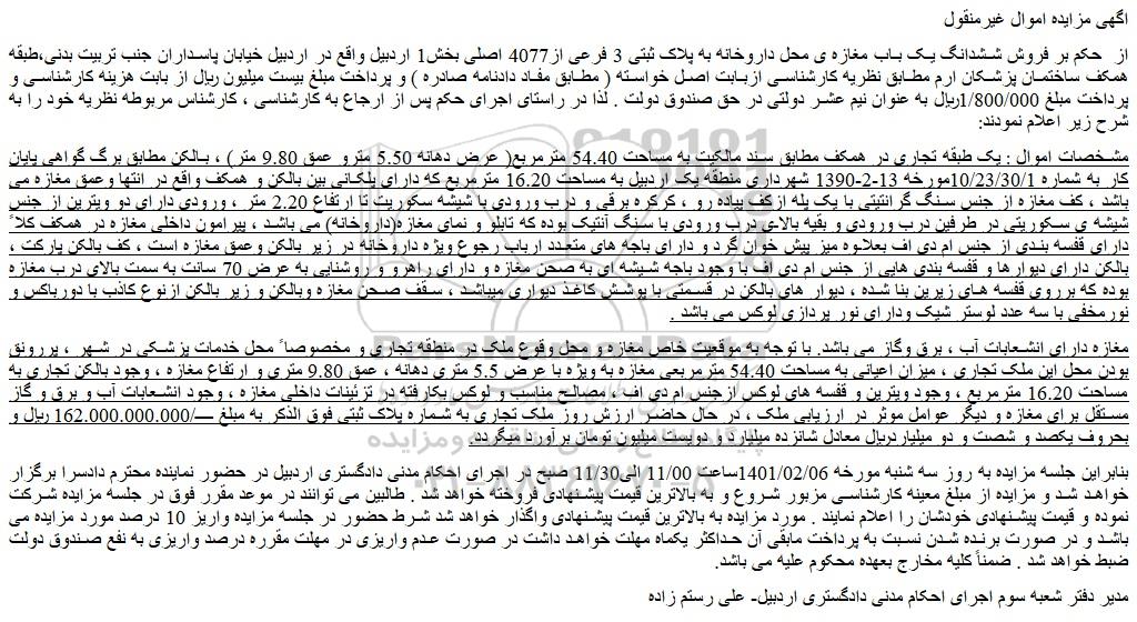 مزایده فروش ششدانگ یک باب مغازه ی محل داروخانه به پلاک ثبتی 3 فرعی از4077 اصلی , مزایده فروش ششدانگ یک باب مغازه ی محل داروخانه به پلاک ثبتی 3 فرعی از4077 اصلی