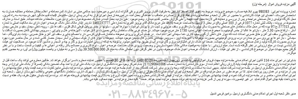 بنابراین در اجرای ماده 114 قانون اجرای احکام مدنی جلسه مزایده جهت فروش اموال توقیفی یادشده در روزچهار شنبه مورخه 1401/02/28 از ساعت 9 الی 9:30صبح با حضور نماینده محترم دادسرا برگزار خواهد شد. طالبین محترم می توانند یک ساعت قبل از انجام مزایده با واریز میزان ده در صد مبلغ قیمت پایه (ارزش ریالی اعلام شده از سوی کارشناس) به شماره حساب 2171290841006 بنام تمرکز وجوه سپرده دادگستری اردبیل نزد بانک ملی ایران یا اخذ چک تضمین بانکی (صرفاً از بانک ملی ایران) در وجه اجرای احکام مدنی دادگستری اردبیل در جلسه مزایده شرکت نمایند. بدیهی است به استثناء برنده مزایده، وجه واریزی سایر شرکت کنندگان بعد از اتمام جلسه مزایده عودت خواهد شد. همچنین برنده مزایده بایستی مابین تفاوت ده درصد قیمت پایه و مبلغ پیشنهادی را پس از مزایده و در همان روز پرداخت نماید. لذا در موعد مقرر در محل مزایده واقع در دفتر شعبه اول اجرای احکام مدنی دادگاه حقوقی اردبیل واقع در اردبیل – شهرک کارشناسان - شهرک اداری- ساختمان دادگاههای عمومی وانقلاب شهرستان اردبیل - شعبه اول اجرای احکام مدنی، حاضر و در جلسه مزایده شرکت نموده و قیمت پیشنهادی خودشان را اعلام نمایند . مزایده از قیمتی که کارشناس محترم پرونده تعیین نموده شروع و به بالاترین قیمت پیشنهادی فروخته خواهد شد. برنده مزایده بایستی منقول ظرف یک هفته و نسبت به پرداخت بقیه بهای اموال اقدام نماید در غیر اینصورت، سپرده او پس از کسر هزینه مزایده به نفع دولت ضبط و مزایده تجدید خواهد. ضمنا" کلیه مخارج مزایده بر عهده محکوم علیه می باشد.