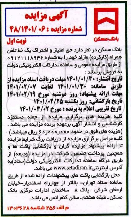 بانک مسکن در نظر دارد حق امتیاز و اشتراک یک خط تلفن همراه کارکرده مازاد خود را به شماره 09121118936 از طریق مزایده عمومی و سامانه تدارکات الکترونیکی دولت به فروش برساند