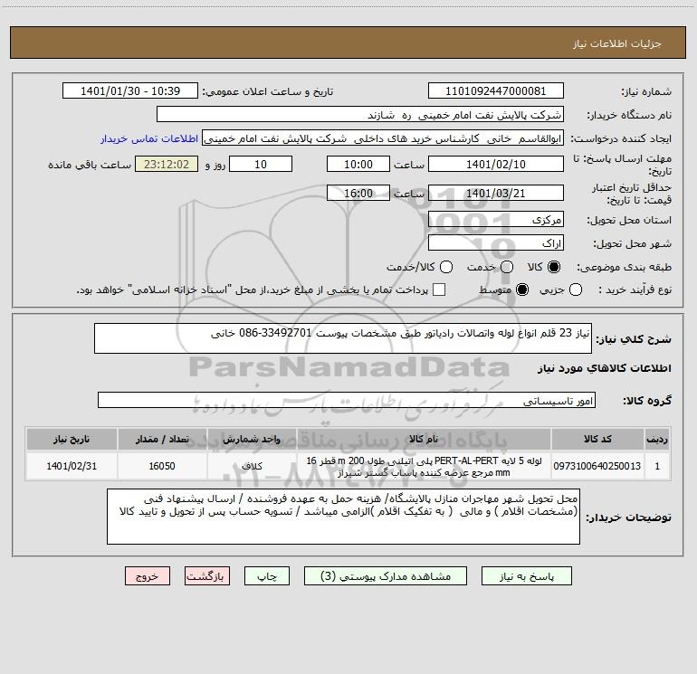 شرح کلی نیاز: نیاز 23 قلم انواع لوله واتصالات رادیاتور طبق مشخصات پیوست 33492701-086 خانی