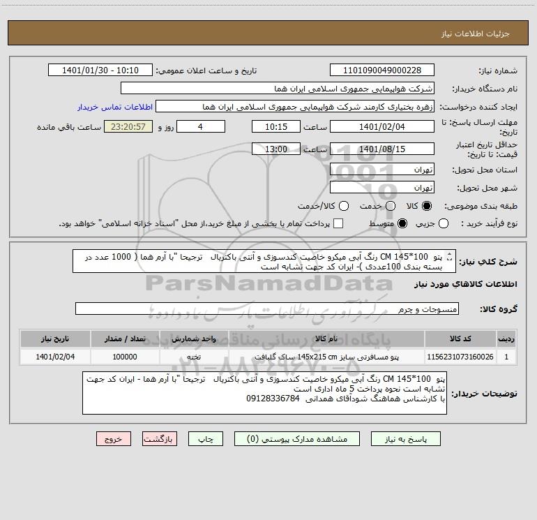 شرح کلی نیاز: پتو 100*145 CM رنگ آبی میکرو خاصیت کندسوزی و آنتی باکتریال ترجیحا "با آرم هما ( 1000 عدد در بسته بندی 100عددی )- ایران کد جهت تشابه است