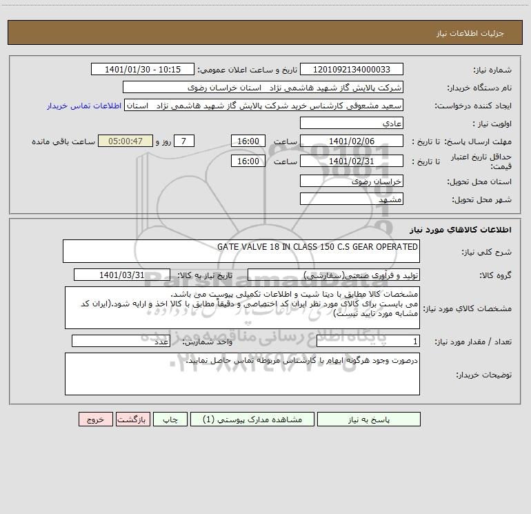 نام دستگاه خریدار:شرکت پالایش گاز شهید هاشمی نژاد استان خراسان رضوی