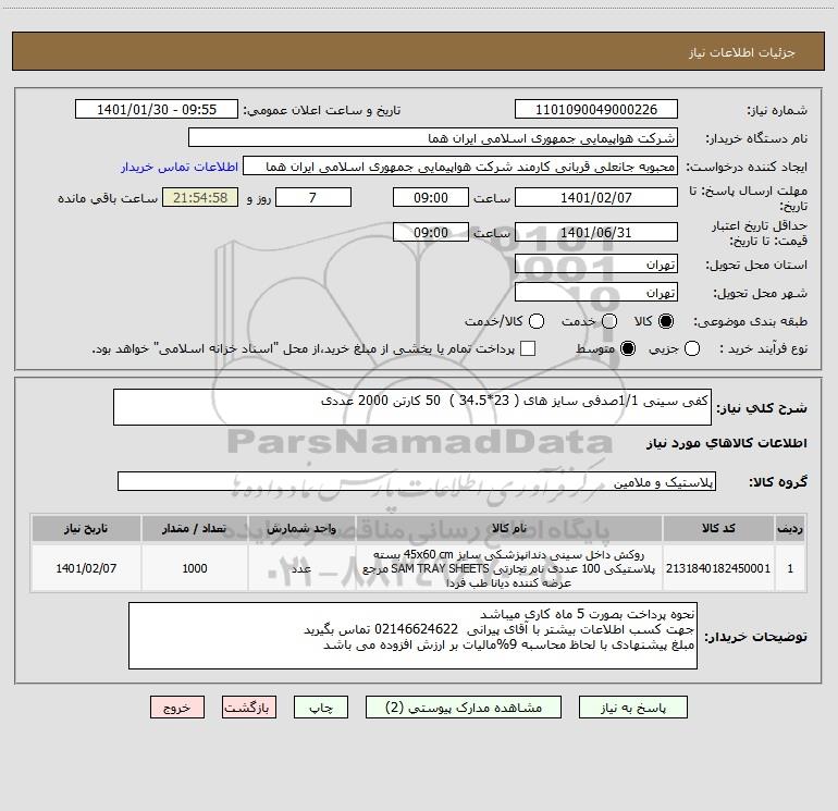 شرح کلی نیاز: کفی سینی 1/1صدفی سایز های ( 23*34.5 ) 50 کارتن 2000 عددی