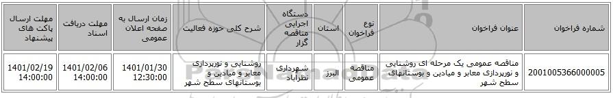 2001005366000005مناقصه عمومی یک مرحله ای روشنایی و نورپردازی معابر و میادین و بوستانهای سطح شهر مناقصه عمومیالبرزشهرداری نظرآبادروشنایی و نورپردازی معابر و میادین و بوستانهای سطح شهر 1401/01/30 12:30:001401/02/06 14:00:001401/02/19 14:00:00