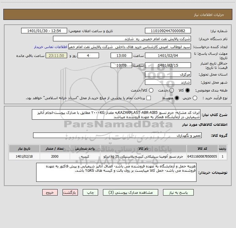 شرح کلی نیاز: ایران کد مشابه- جرم نسوز KAZARPLAST-ABR-AI85به مقدار ۲۰۰۰KG مطابق با مدارک پیوست-انجام آنالیز شیمیایی در آزمایشگاه همکار به عهده فروشنده میباشد
