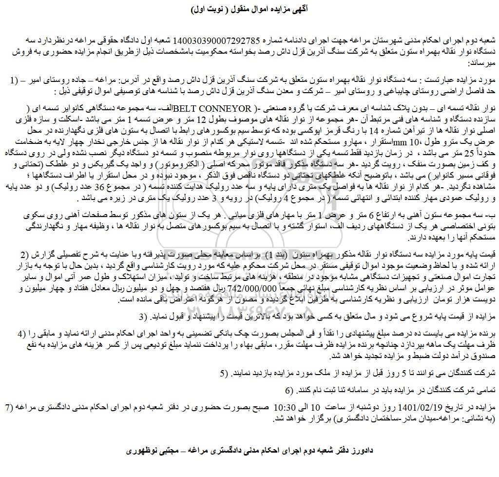 شعبه دوم اجرای احکام مدنی شهرستان مراغه جهت اجرای دادنامه شماره 140030390007292785 شعبه اول دادگاه حقوقی مراغه درنظردارد سه دستگاه نوار نقاله بهمراه ستون متعلق به شرکت سنگ آذرین قزل داش رصد بخواسته محکومیت بامشخصات ذیل ازطریق انجام مزایده حضوری به فروش میرساند: