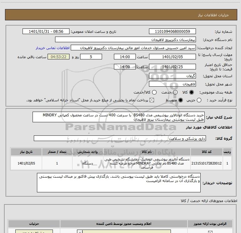 شرح کلی نیاز: خرید دستگاه اتوآنالایزر بیوشیمی مدل BS480 با سرعت 400 تست در ساعت محصول کمپانی MINDRY طبق لیست پیوستی بیمارستان پیروز لاهیجان