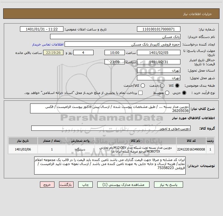 شرح کلی نیاز: دوربین مدار بسته ... / طبق مشخصات پیوست شده / ارسال پیش فاکتور پیوست الزامیست / فکس 26205036