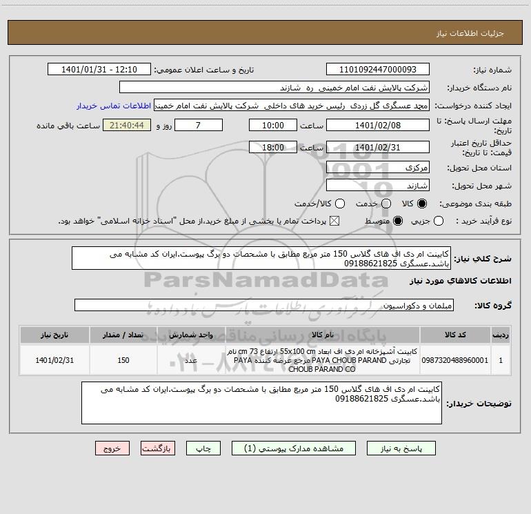 شرح کلی نیاز: کابینت ام دی اف های گلاس 150 متر مربع مطابق با مشحصات دو برگ پیوست.ایران کد مشابه می باشد.عسگری 09188621825
