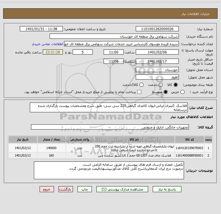 شرح کلی نیاز: فلاسک 1لیتری ایرانی-لیوان کاغذی گیاهی220 سی سی- طبق شرح ومشخصات پیوست بارگذاری شده درسامانه