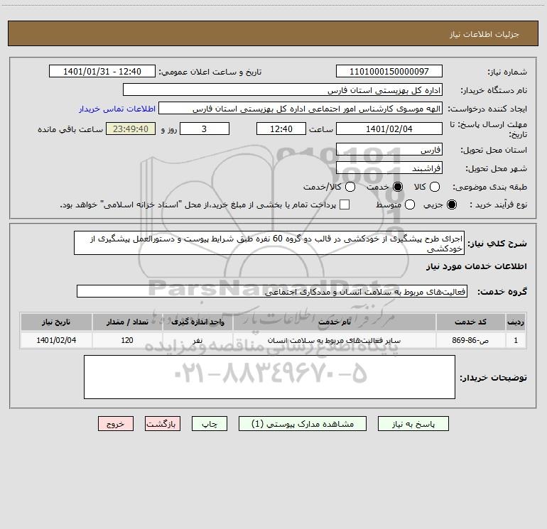 شرح کلی نیاز: اجرای طرح پیشگیری از خودکشی در قالب دو گروه 60 نفره طبق شرایط پیوست و دستورالعمل پیشگیری از خودکشی