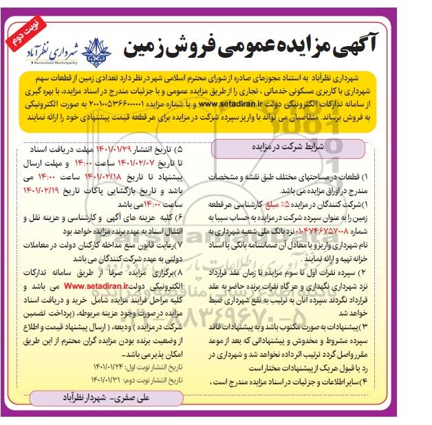 موضوع مزایده : فروش تعدادی زمین از قطعات سهم شهرداری با کاربری مسکونی خدماتی، تجاری
