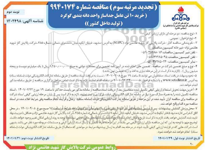 3- نام ونشانی مناقصهگزار: شرکت پالایش گاز شهید هاشمی نژاد (SGPC) به آدرس: مشهد، خیابان آبکوه، نبش دانشسرای شمالی، شماره 255، شرکت پالایش گاز شهید هاشمی نژاد