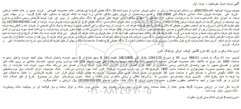 بموجب پرونده اجراییبه کلاسه0001592و در راستای اجرای مفاد و رای و دستور فروش صادره از سوی شعبه 16 دادگاه حقوقی کرج ما بین خواهان : خانم معصومه قهرمانی فرزند حسین و خانم فاطمه ترخانی فرزند علی بخواسته فروش ملک مشاعی به پلاک ثبتی 168/10898 و تقسیم وجه حاصل از فروش مابین مالکین مشاعی و با توجه به اینکه اجراییه به محکوم علیه ابلاغ گردیده و در مهلت مقرر نسبت به اجرای حکم اقدام ننموده است بنا به درخواست محکوم له و به منظور استیفای محکوم به و هزینه های اجرایی 6 دانگ ملک مذکور از سوی این اجرا توسط کارشناس رسمی دادگستری به شرح زیر توصیف و ارزیابی گردیده از طریق مزایده درمورخ1401/2/24از ساعت 10 تا 11 صبح در محل اجرای احکام مدنی دادگاه حقوقی کرج از طریق مزایده بفروش برسد. مزایده از قیمت 162/000/000/000 ریال طبق نظریه کارشناس شروع و به هر شخص حقیقی و حقوقی که بالاترین قیمت را بدهد فروخته خواهد شد. ده درصد از وجه مزایده را فی المجلس بصورت وجه نقد یا چک بانکی تضمینی از خریدار اخذ و الباقی وجه مزایده ظرف یک ماه از وی وصول و پس از انجام مراحل قانونی و صدور حکم تملیک مورد مزایده به نام خریدار منتقل خواهد شد. در صورتی که در مهلت مقرر خریدار وجه مزایده را پرداخت ننماید سپرده وی پس از کسر هزینه های مزایده به نفع دولت ضبط و مزایده تجدید می گردد. کلیه هزینه های نقل وانتقال بعهده محکوم علیه است که از محل فروش پرداخت خواهد شد طرفین می توانند ظرف مدت یک هفته از تاریخ مزایده نسبت به نحوه انجام مزایده اعتراض نمایند که در این صورت تا رسیدگی به اعتراضاز سوی دادگاه مورد مزایده بنام خریدار منتقل نخواهد شد ضمنا طالبین شرکت در مزایده می توانند ظرف 5 روز قبل از مزایده بااطلاع از مال مورد مزایده بازدید نمایند. آدرس محل انجام مزایده کرج بلوار ملاصدرا روبروی پارک نبوت ساختمان شماره 2 دادگاه حقوقی کرج طبقه 3 مشخصات ملک و بهای آن طبق نظریه کارشناس بدین شرح است.مشخصات فنی و مدارک ابرازی :