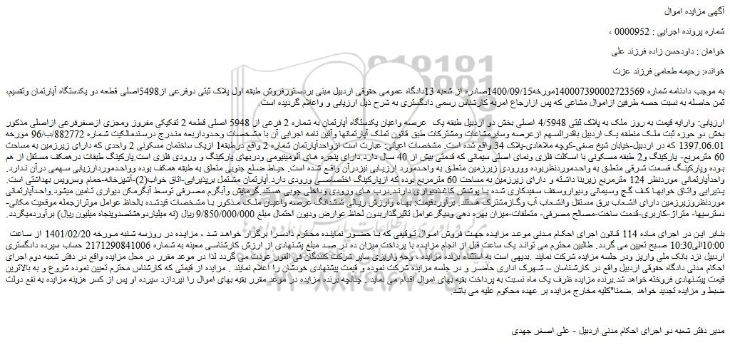 ،به موجب دادنامه شماره 140007390002723569مورخه1400/09/15صادره از شعبه 13دادگاه عمومی حقوقی اردبیل مبنی بردستورفروش طبقه اول پلاک ثبتی دوفرعی از5498اصلی قطعه دو یکدستگاه آپارتمان وتقسیم ثمن حاصله به نسبت حصه طرفین ازاموال مشاعی که پس ازارجاع امربه کارشناس رسمی دادگستری به شرح ذیل ارزیابی و واعلام گردیده است.