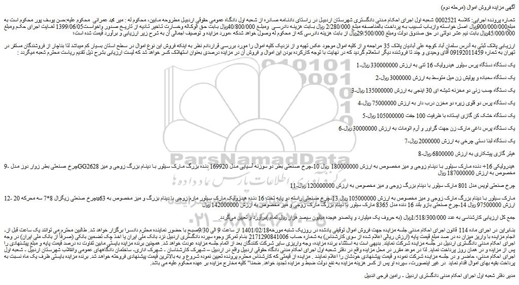 شماره پرونده اجرایی: کلاسه 0002521 شعبه اول اجرای احکام مدنی دادگستری شهرستان اردبیل در راستای دادنامه صادره از شعبه اول دادگاه عمومی حقوقی اردبیل مطروحه مابین، محکوم له : میر محمد عمرانی محکوم علیه:حسن یوسف پور محکوم است به مبلغ900/000/000ریال اصل خواسته وازباب تسبیب به پرداخت بالمناصفه مبلغ 2/280/000 ریال بابت هزینه دادرسی ومبلغ 40/800/000ریال بابت حق الوکاله وخسارت تاخیر تادیه از تاریخ صدور واخواست1399/06/05 لغایت اجرای حکم ومبلغ 45/000/000ریال بابت نیم عشر دولتی در حق صندوق دولت ومبلغ 29/500/000ریال از بابت هزینه دادرسی که از محکوم له وصول خواهد شدکه ،مورد مزایده و توصیف اجمالی آن به شرح زیر ارزیابی و برآورد قیمت شده است؛