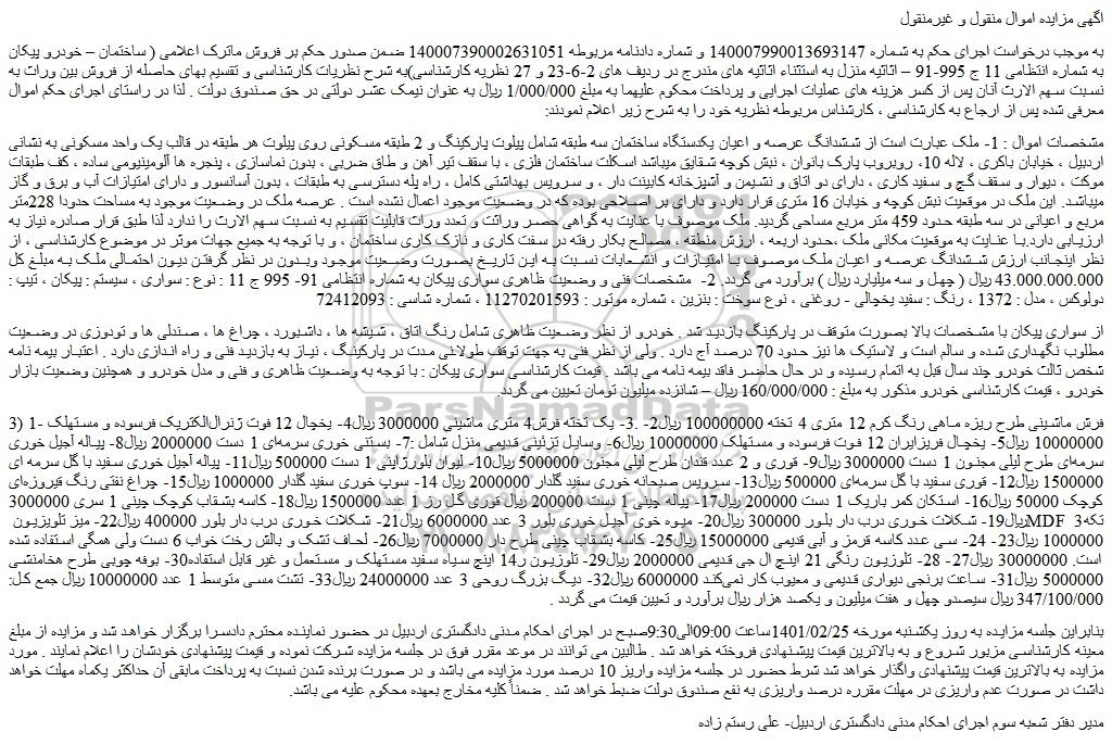 مشخصات اموال : 1- ملک عبارت است از ششدانگ عرصه و اعیان یکدستگاه ساختمان سه طبقه شامل پیلوت پارکینگ و 2 طبقه مسکونی روی پیلوت هر طبقه در قالب یک واحد مسکونی به نشانی اردبیل ، خیابان باکری ، لاله 10، روبروب پارک بانوان ، نبش کوچه شقایق میباشد اسکلت ساختمان فلزی ، با سقف تیر آهن و طاق ضربی ، بدون نماسازی ، پنجره ها آلومینیومی ساده ، کف طبقات موکت ، دیوار و سقف گچ و سفید کاری ، دارای دو اتاق و نشیمن و آشپزخانه کابینت دار ، و سرویس بهداشتی کامل ، راه پله دسترسی به طبقات ، بدون آسانسور و دارای امتیازات آب و برق و گاز میباشد. این ملک در موقعیت نبش کوچه و خیابان 16 متری قرار دارد و دارای بر اصلاحی بوده که در وضعیت موجود اعمال نشده است . عرصه ملک در وضعیت موجود به مساحت حدودا 228متر مربع و اعیانی در سه طبقه حدود 459 متر مربع مساحی گردید. ملک موصوف با عنایت به گواهی حصر وراثت و تعدد وراث قابلیت تقسیم به نسبت سهم الارث را ندارد لذا طبق قرار صادره نیاز به ارزیابی دارد.با عنایت به موقعیت مکانی ملک ،حدود اربعه ، ارزش منطقه ، مصالح بکار رفته در سفت کاری و نازک کاری ساختمان ، و با توجه به جمیع جهات موثر در موضوع کارشناسی ، از نظر اینجانب ارزش ششدانگ عرصه و اعیان ملک موصوف با امتیازات و انشعابات نسبت به این تاریخ بصورت وضعیت موجود وبدون در نظر گرفتن دیون احتمالی ملک به مبلغ کل 43.000.000.000 ریال ( چهل و سه میلیارد ریال ) برآورد می گردد. 2-  مشخصات فنی و وضعیت ظاهری سواری پیکان به شماره انتظامی 91- 995 ج 11 : نوع : سواری ، سیستم : پیکان ، تیپ : دولوکس ، مدل : 1372 ، رنگ : سفید یخچالی - روغنی ، نوع سوخت : بنزین ، شماره موتور : 11270201593 ، شماره شاسی : 72412093