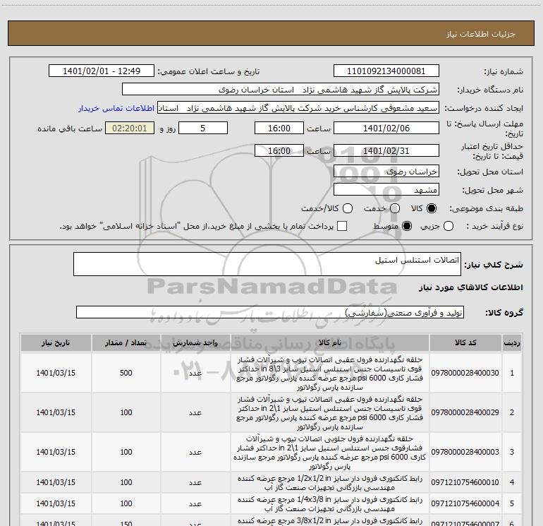 نام دستگاه خریدار:شرکت پالایش گاز شهید هاشمی نژاد استان خراسان رضوی