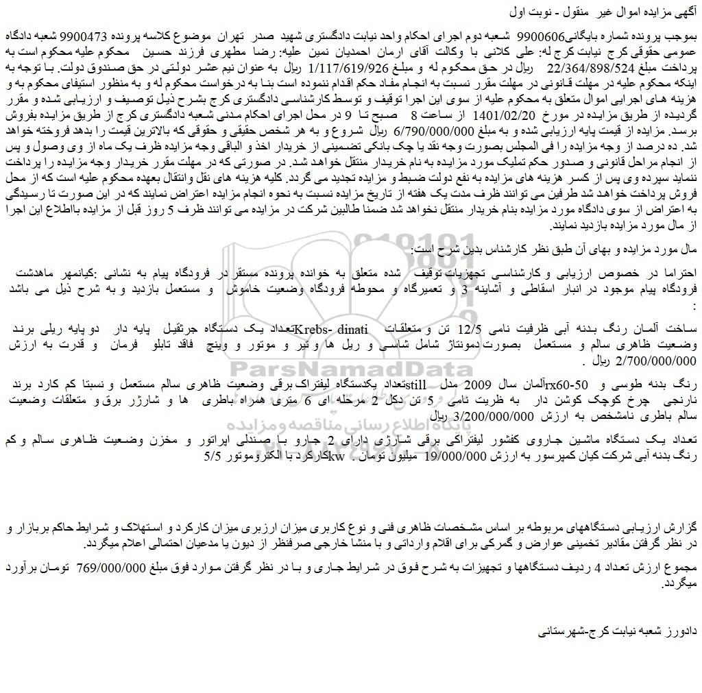 بموجب پرونده شماره بایگانی9900606 شعبه دوم اجرای احکام واحد نیابت دادگستری شهید صدر تهران موضوع کلاسه پرونده 9900473 شعبه دادگاه عمومی حقوقی کرج نیابت کرج له: علی کلانی با وکالت آقای ارمان احمدیان نمین علیه: رضا مطهری فرزند حسین محکوم علیه محکوم است به پرداخت مبلغ 22/364/898/524 ریال در حق محکوم له و مبلغ 1/117/619/926 ریال به عنوان نیم عشر دولتی در حق صندوق دولت. با توجه به اینکه محکوم علیه در مهلت قانونی در مهلت مقرر نسبت به انجام مفاد حکم اقدام ننموده است بنا به درخواست محکوم له و به منظور استیفای محکوم به و هزینه های اجرایی اموال متعلق به محکوم علیه از سوی این اجرا توقیف و توسط کارشناسی دادگستری کرج بشرح ذیل توصیف و ارزیابی شده و مقرر گردیده از طریق مزایده در مورخ 1401/02/20 از ساعت 8 صبح تا 9 در محل اجرای احکام مدنی شعبه دادگستری کرج از طریق مزایده بفروش برسد. مزایده از قیمت پایه ارزیابی شده و به مبلغ 6/790/000/000 ریال شروع و به هر شخص حقیقی و حقوقی که بالاترین قیمت را بدهد فروخته خواهد شد. ده درصد از وجه مزایده را فی المجلس بصورت وجه نقد یا چک بانکی تضمینی از خریدار اخذ و الباقی وجه مزایده ظرف یک ماه از وی وصول و پس از انجام مراحل قانونی و صدور حکم تملیک مورد مزایده به نام خریدار منتقل خواهد شد. در صورتی که در مهلت مقرر خریدار وجه مزایده را پرداخت ننماید سپرده وی پس از کسر هزینه های مزایده به نفع دولت ضبط و مزایده تجدید می گردد. کلیه هزینه های نقل وانتقال بعهده محکوم علیه است که از محل فروش پرداخت خواهد شد طرفین می توانند ظرف مدت یک هفته از تاریخ مزایده نسبت به نحوه انجام مزایده اعتراض نمایند که در این صورت تا رسیدگی به اعتراض از سوی دادگاه مورد مزایده بنام خریدار منتقل نخواهد شد ضمنا طالبین شرکت در مزایده می توانند ظرف 5 روز قبل از مزایده بااطلاع این اجرا از مال مورد مزایده بازدید نمایند.