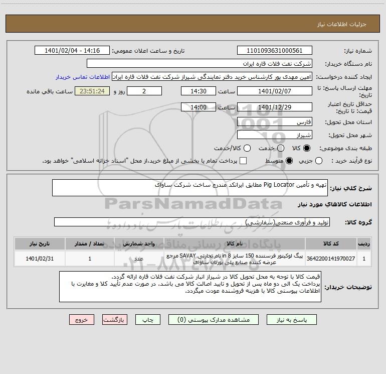 شرح کلی نیاز: تهیه و تأمین Pig Locator مطابق ایرانکد مندرج ساخت شرکت ساوای