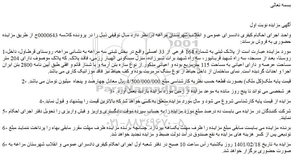 6- مزایده به تاریخ 1401/02/18 روز یکشنبه رأس ساعت 10 صبح در دفتر شعبه اول اجرای احکام کیفری دادسرای عمومی و انقلاب شهرستان مراغه به صورت حضوری برگزار خواهد شد.