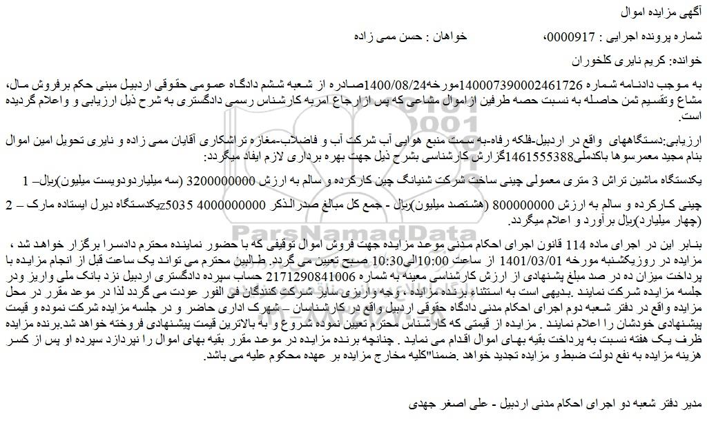 شماره پرونده اجرایی : 0000917،                      خواهان : حسن ممی زاده