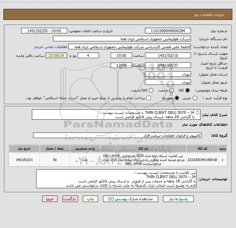 شرح کلی نیاز: THIN CLIENT DELL 5070 – J4 با مشخصات لیست پیوست :