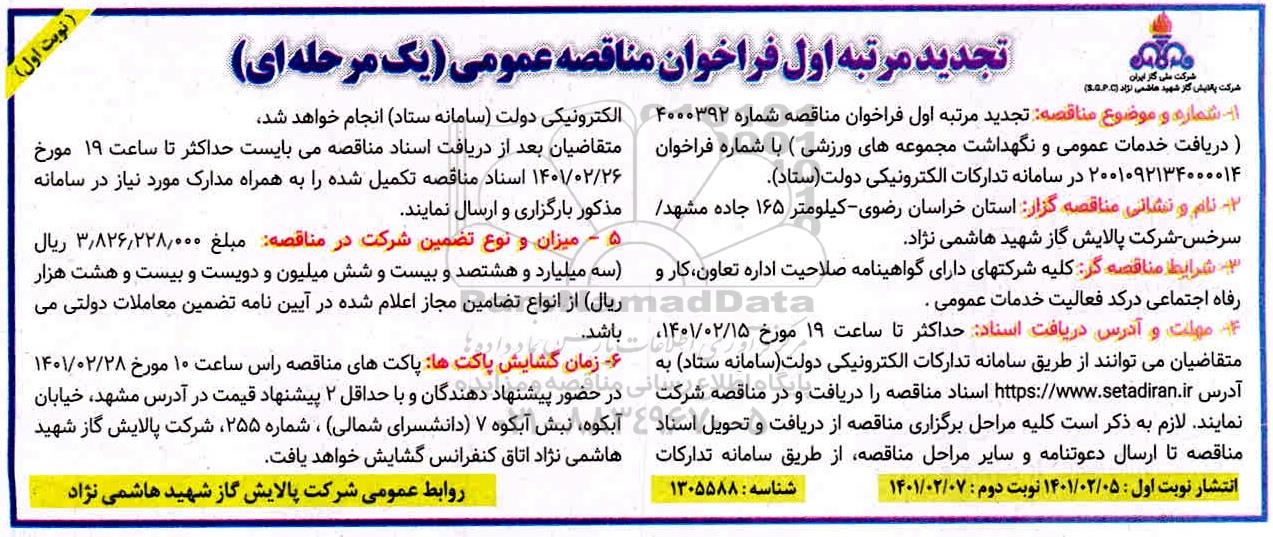 1- شماره و موضوع مناقصه: تجدید مناقصه شماره 4000392 (دریافت خدمات عمومی و نگهداشت مجموعه های ورزشی ) با شماره فراخوان 2001092134000014 در سامانه تدارکات الکترونیکی دولت (ستاد)