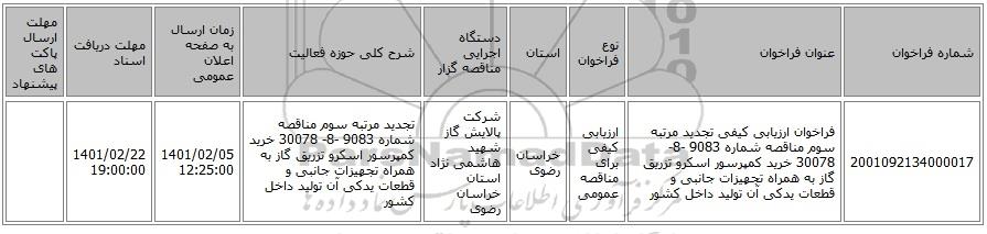 | 2001092134000017 | فراخوان ارزیابی کیفی تجدید مرتبه سوم مناقصه شماره 9083 -8- 30078 خرید کمپرسور اسکرو تزریق گاز به همراه تجهیزات جانبی و قطعات یدکی آن تولید داخل کشور | ارزیابی کیفی برای مناقصه عمومی | خراسان رضوی | شرکت پالایش گاز شهید هاشمی نژاد استان خراسان رضوی | تجدید مرتبه سوم مناقصه شماره 9083 -8- 30078 خرید کمپرسور اسکرو تزریق گاز به همراه تجهیزات جانبی و قطعات یدکی آن تولید داخل کشور | 1401/02/05 12:25:00 | 1401/02/22 19:00:00 |