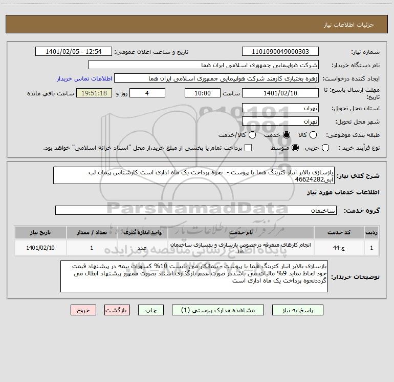 شرح کلی نیاز: بازسازی بالابر انبار کترینگ هما با پیوست - نحوه پرداخت یک ماه اداری است کارشناس پیمان لب آبی46624282
