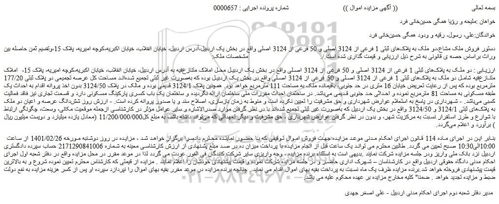 دستور فروش ملک مشاع،دو ملک به پلاک های ثبتی 1 فرعی از 3124 اصلی و 50 فرعی از 3124 اصلی واقع در بخش یک اردبیل،آدرس اردبیل، خیابان انقلاب، خیابان اکبریه،کوچه امیریه، پلاک 15،وتقسیم ثمن حاصله بین وراث براساس حصه ی قانونی به شرح ذیل ارزیابی و قیمت گذاری شده است./. مشخصات ملک: