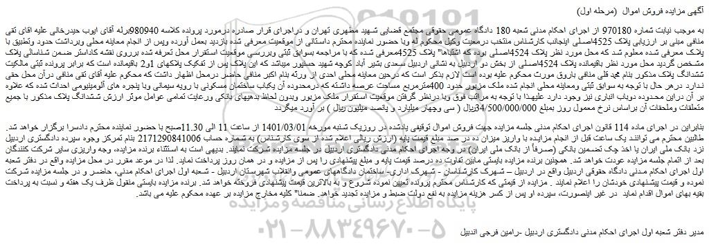 بنابراین در اجرای ماده 114 قانون اجرای احکام مدنی جلسه مزایده جهت فروش اموال توقیفی یادشده در روزیک شنبه مورخه 1401/03/01 از ساعت 11 الی 11.30صبح با حضور نماینده محترم دادسرا برگزار خواهد شد. طالبین محترم می توانند یک ساعت قبل از انجام مزایده با واریز میزان ده در صد مبلغ قیمت پایه (ارزش ریالی اعلام شده از سوی کارشناس) به شماره حساب 2171290841006 بنام تمرکز وجوه سپرده دادگستری اردبیل نزد بانک ملی ایران یا اخذ چک تضمین بانکی (صرفاً از بانک ملی ایران) در وجه اجرای احکام مدنی دادگستری اردبیل در جلسه مزایده شرکت نمایند. بدیهی است به استثناء برنده مزایده، وجه واریزی سایر شرکت کنندگان بعد از اتمام جلسه مزایده عودت خواهد شد. همچنین برنده مزایده بایستی مابین تفاوت ده درصد قیمت پایه و مبلغ پیشنهادی را پس از مزایده و در همان روز پرداخت نماید. لذا در موعد مقرر در محل مزایده واقع در دفتر شعبه اول اجرای احکام مدنی دادگاه حقوقی اردبیل واقع در اردبیل – شهرک کارشناسان - شهرک اداری- ساختمان دادگاههای عمومی وانقلاب شهرستان اردبیل - شعبه اول اجرای احکام مدنی، حاضر و در جلسه مزایده شرکت نموده و قیمت پیشنهادی خودشان را اعلام نمایند . مزایده از قیمتی که کارشناس محترم پرونده تعیین نموده شروع و به بالاترین قیمت پیشنهادی فروخته خواهد شد. برنده مزایده بایستی منقول ظرف یک هفته و نسبت به پرداخت بقیه بهای اموال اقدام نماید  در غیر اینصورت، سپرده او پس از کسر هزینه مزایده به نفع دولت ضبط و مزایده تجدید خواهد. ضمنا" کلیه مخارج مزایده بر عهده محکوم علیه می باشد.