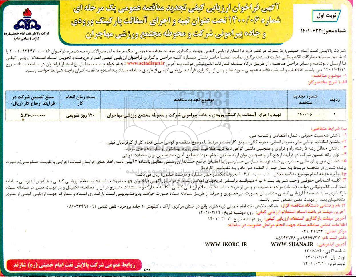 شماره 1400/06 تحت عنوان تهیه و اجرای آسفالت پارکینگ ورودی و جاده پیرامونی شرکت و محوطه مجتمع ورزشی مهاجران
