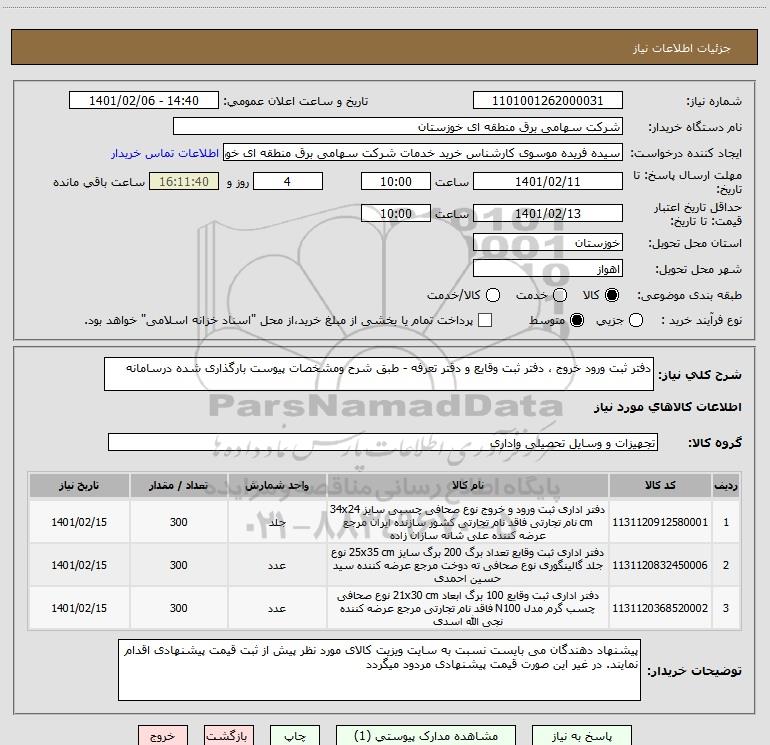 شرح کلی نیاز: دفتر ثبت ورود خروج ، دفتر ثبت وقایع و دقتر تعرفه - طبق شرح ومشخصات پیوست بارگذاری شده درسامانه