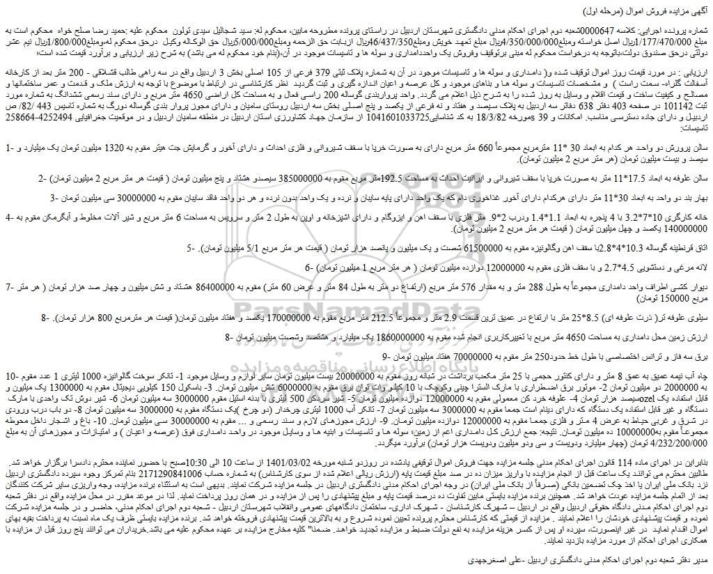 شماره پرونده اجرایی: کلاسه 0000647شعبه دوم اجرای احکام مدنی دادگستری شهرستان اردبیل در راستای پرونده مطروحه مابین، محکوم له: سید شجائیل سیدی تولون محکوم علیه :حمید رضا صلح خواه محکوم است به مبلغ 1/177/470/000ریال اصل خواسته ومبلغ4/350/000/000ریال مبلغ تعهد خویش ومبلغ46/437/350ریال ازبابت حق الزحمه ومبلغ5/000/000ریال حق الوکاله وکیل درحق محکوم له،ومبلغ1/800/000ریال نیم عشر دولتی درحق صندوق دولت،باتوجه به درخواست محکوم له مبنی برتوقیف وفروش یک واحددامداری و سوله ها و تاسیسات موجود در آن،(بنام خود محکوم له می باشد) به شرح زیر ارزیابی و برآورد قیمت شده است؛