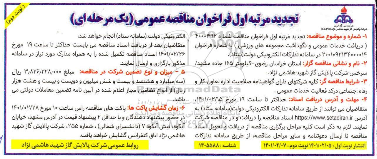 1- شماره و موضوع مناقصه: تجدید مناقصه شماره 4000392 (دریافت خدمات عمومی و نگهداشت مجموعه های ورزشی ) با شماره فراخوان 2001092134000014 در سامانه تدارکات الکترونیکی دولت (ستاد)