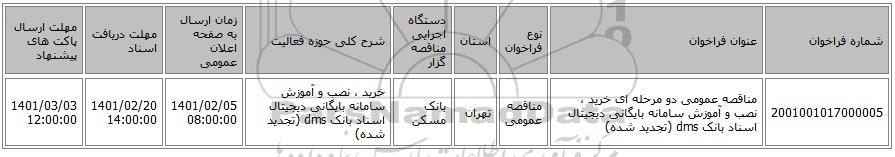 2001001017000005مناقصه عمومی دو مرحله ای خرید ، نصب و آموزش سامانه بایگانی دیجیتال اسناد بانک dms (تجدید شده) مناقصه عمومیتهرانبانک مسکنخرید ، نصب و آموزش سامانه بایگانی دیجیتال اسناد بانک dms (تجدید شده) 1401/02/05 08:00:001401/02/20 14:00:001401/03/03 12:00:00