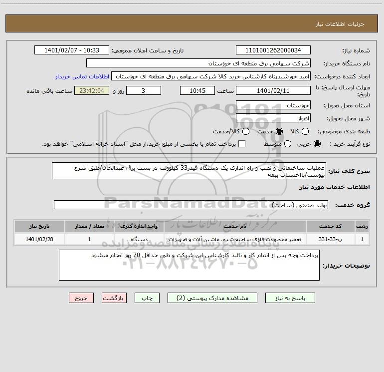 شرح کلی نیاز: عملیات ساختمانی و نصب و راه اندازی یک دستگاه فیدر33 کیلوولت در پست برق عبدالخان/طبق شرح پیوست/بااحتساب بیمه