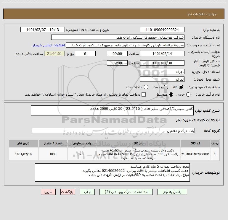 شرح کلی نیاز: کفی سینی2/1صدفی سایز های ( 16*23.5 ) 50 کارتن 2000 عددی-