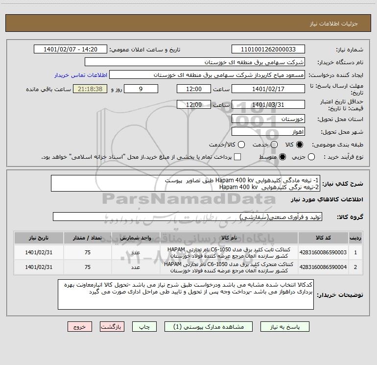شرح کلی نیاز: 1- تیغه مادگی کلیدهوایی Hapam 400 kv طبق تصاویر پیوست 2-تیغه نرگی کلیدهوایی Hapam 400 kv