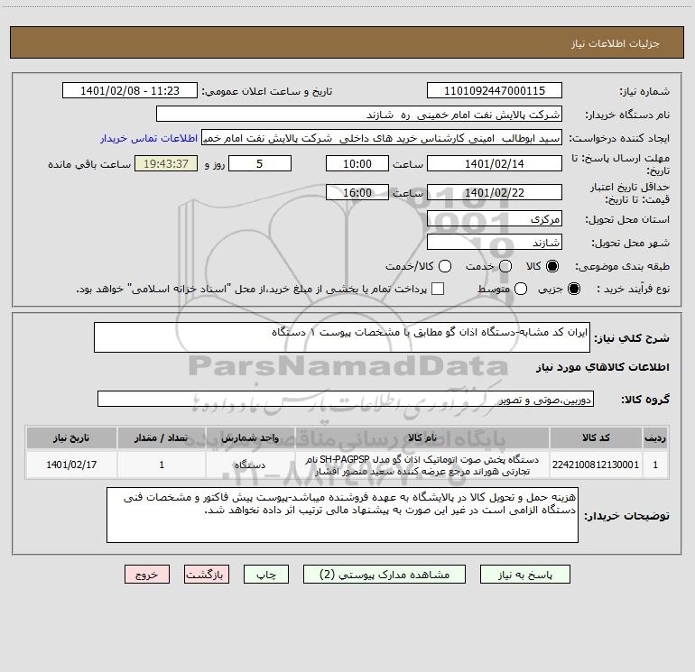 شرح کلی نیاز: ایران کد مشابه-دستگاه اذان گو مطابق با مشخصات پیوست ۱ دستگاه