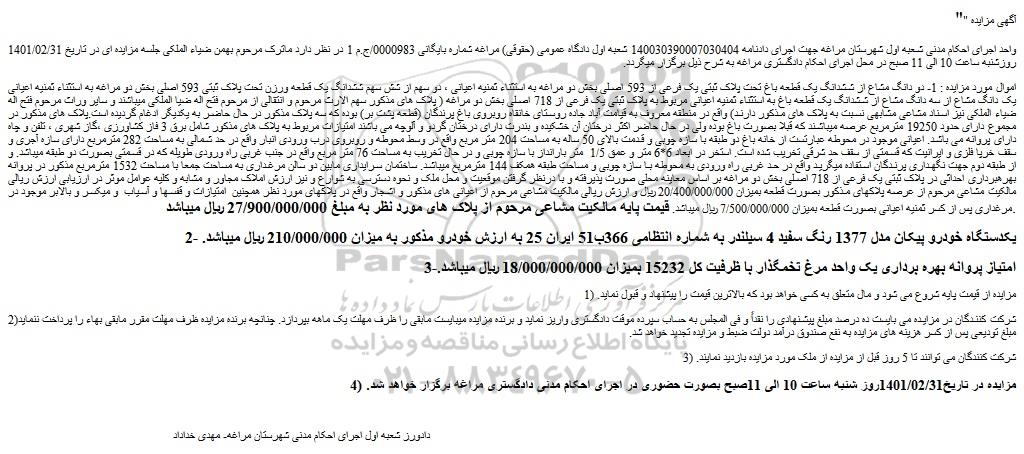 مزایده فروش  1- دو دانگ مشاع از ششدانگ یک قطعه باغ تحت پلاک ثبتی یک فرعی از 593 اصلی  و...